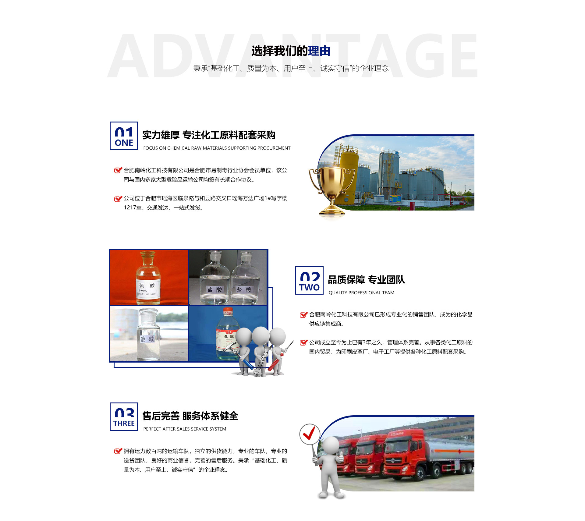 關(guān)于我們合肥南嶺化工科技有限公司是合肥市易制毒行業(yè)協(xié)會(huì)會(huì)員單位,該公司與國(guó)內(nèi)多家大型危險(xiǎn)品運(yùn)輸公司均簽有長(zhǎng)期合作協(xié)議,擁有運(yùn)力數(shù)百噸的運(yùn)輸車(chē)隊(duì),獨(dú)立的供貨能力,良好的車(chē)隊(duì)運(yùn)輸,有效的送貨團(tuán)隊(duì),良好的商業(yè)信譽(yù),完善的售后服務(wù)。秉承“基礎(chǔ)化工、質(zhì)量為本、用戶至上、誠(chéng)實(shí)守信”的企業(yè)理念。從事各類(lèi)化工原料的國(guó)內(nèi)貿(mào)易;為各個(gè)化工廠、印刷皮革廠、電子工廠等提供各種化工原料配套采購(gòu)。目前,公司正朝著以貿(mào)易為基礎(chǔ)、以實(shí)業(yè)為依托,采購(gòu)、銷(xiāo)售,內(nèi)外貿(mào)一體化,上下游一體化,具有綜合增值能力和復(fù)合競(jìng)爭(zhēng)能力化工原料供應(yīng)商。本公司主要經(jīng)營(yíng)的產(chǎn)品有:鹽酸、硫酸、液堿、片堿等。合肥南嶺化工科技有限公司已形成服務(wù),售后一體化的團(tuán)隊(duì)、成為的化學(xué)品供應(yīng)鏈集成商。為客戶提供良好的服務(wù)及產(chǎn)品,本公司經(jīng)銷(xiāo)的各種產(chǎn)品不僅在安徽地區(qū)深受用戶好評(píng),而且具有很高的市場(chǎng)占有率,產(chǎn)品行銷(xiāo)各個(gè)地區(qū)。